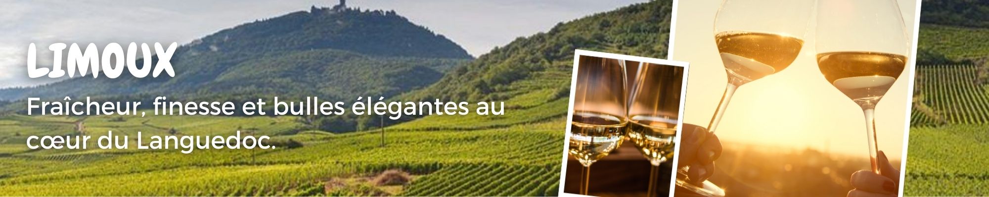 Située au pied des Pyrénées, l’appellation Limoux est reconnue pour ses vins effervescents raffinés et ses vins blancs frais et élégants. Élaborées principalement à partir de Chardonnay, Chenin ou Mauzac, les cuvées de Limoux séduisent par leur vivacité, leurs arômes d’agrumes, de pomme et de fleurs blanches. Grâce à son climat plus frais, Limoux offre des vins équilibrés, précis et particulièrement appréciés à l’apéritif ou à table.