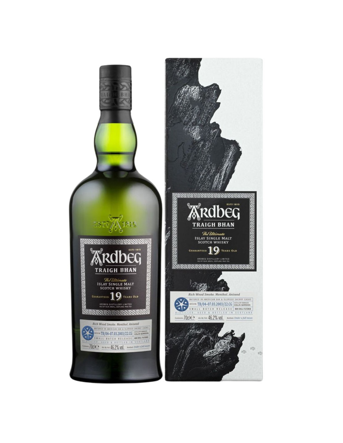 Élevé dans une proportion légèrement plus élevée de fûts de Sherry Oloroso, ce sublime whisky de 19 ans est l'incarnation même d'un Ardbeg vieilli. Faisant partie d'une série Ardbeg très recherchée et à collectionner. Ce sublime Traigh Bhan, comme les flacons qui l?ont précédé, inspiré de la plage Traigh Bhan d?Islay (prononcer tri-van). Ardbeg Traigh Bhan réalise magistralement l'impossible ? équilibrant l'accalmie et le crescendo de ses saveurs intenses. Mis en bouteille sous une pleine lune, le vent a tourné pour ce spiritueux rare alors que des notes plus mentholées et herbacées affolent les sens, avec une fumée intense laissée dans son sillage tourbé.